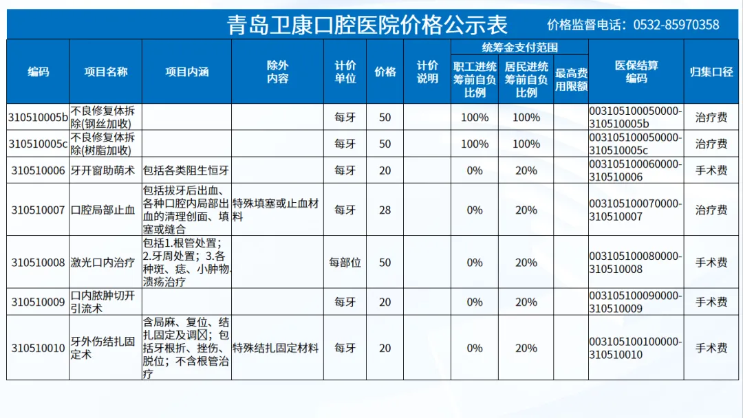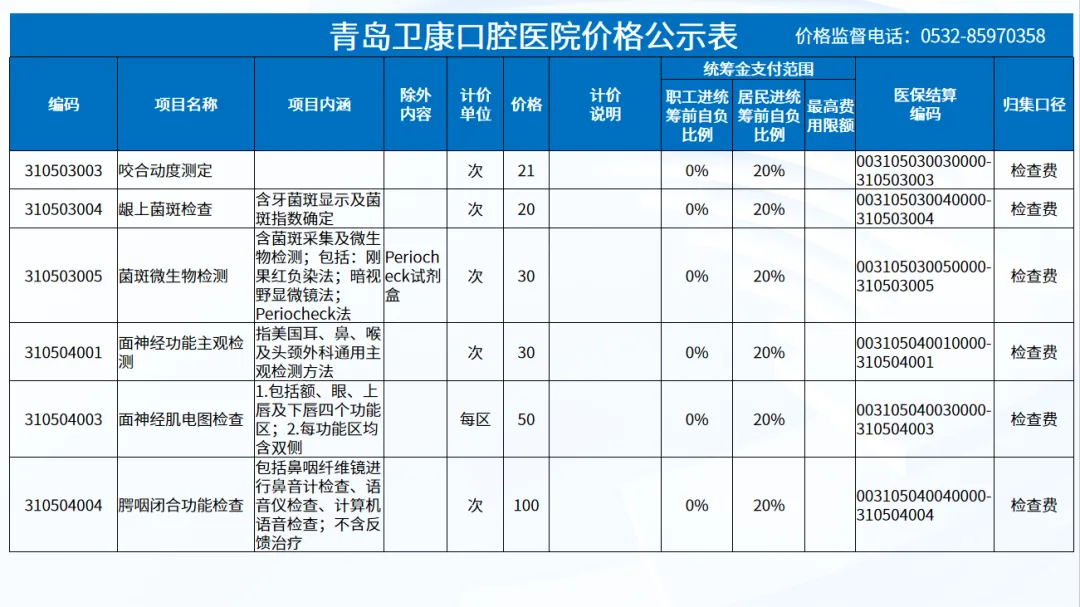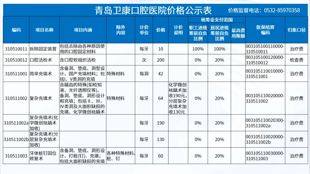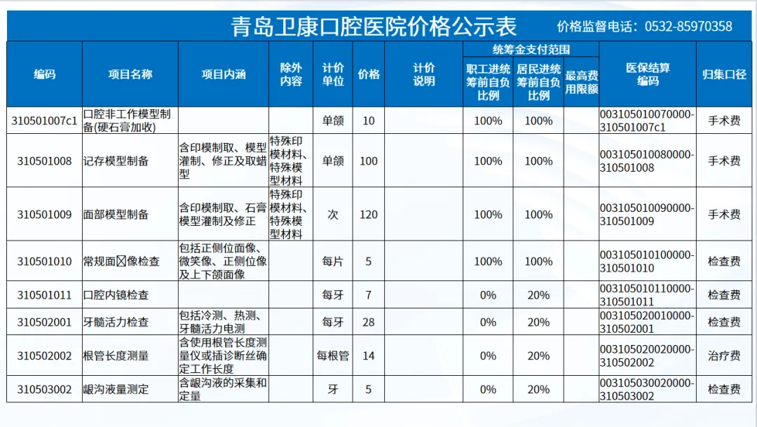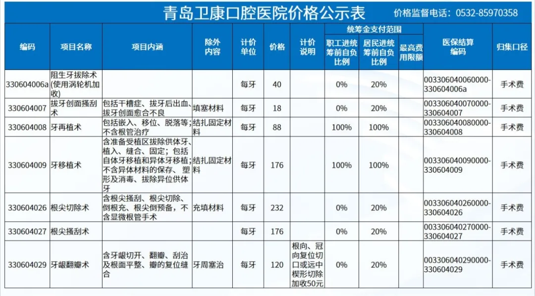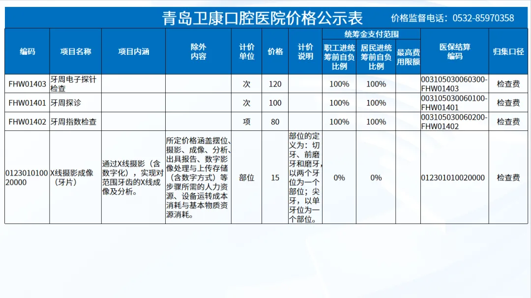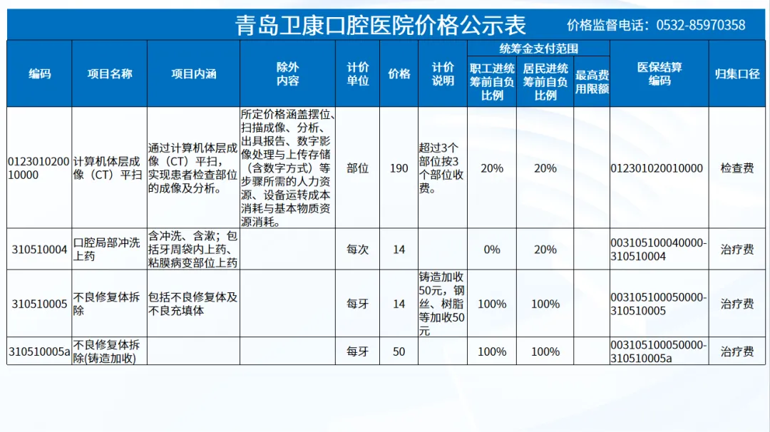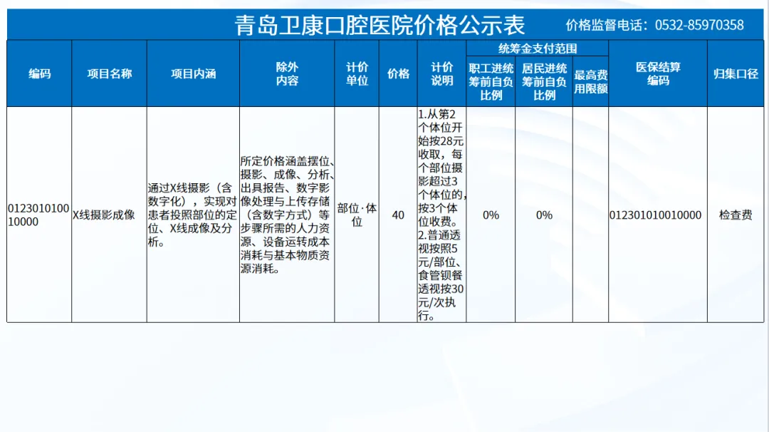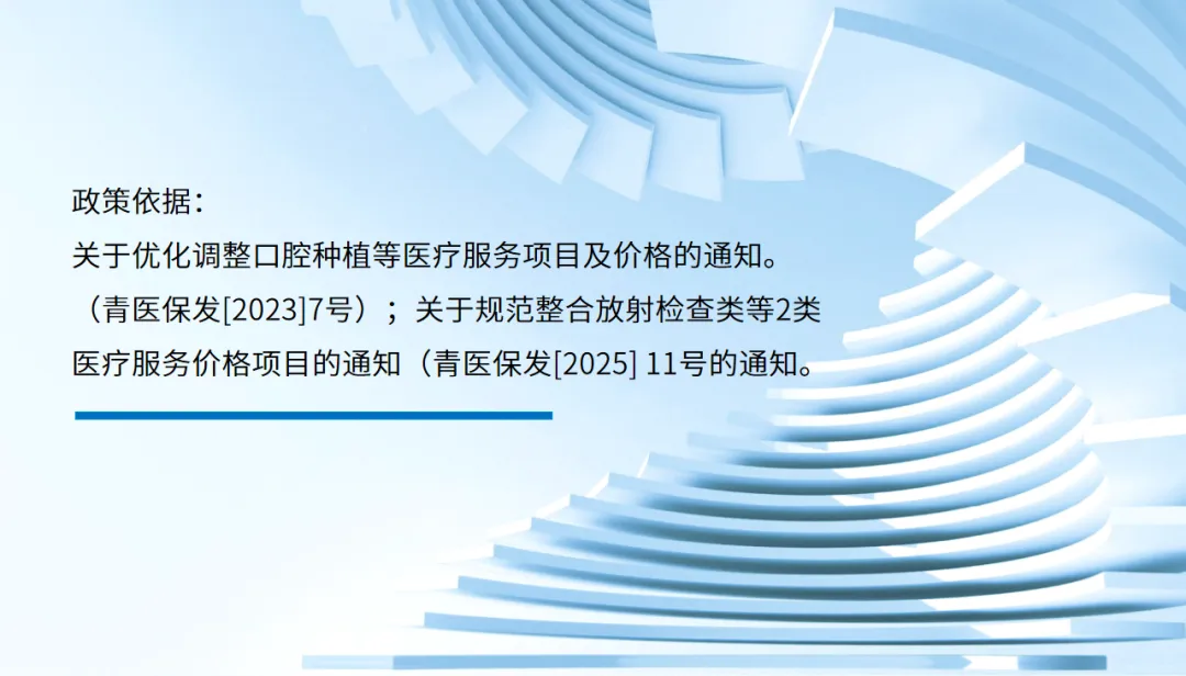 政策依据: 关于优化调整口腔种植等医疗服务项目及价格的通知。 (青医保发[2023]7号);关于规范整合放射检查类等2类医疗服务价格项目的通知(青医保发[2025] 11号的通知。
